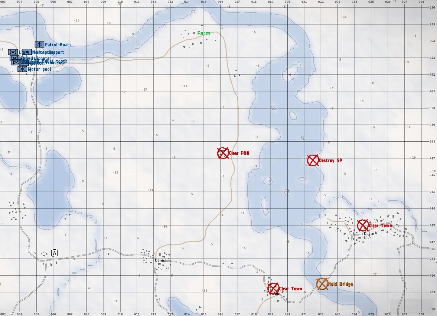 A. Enemy Forces: Consists of elements of the 3rd HAF infantry division with light armour support but no air or artillery support is probable. There is still about a section level strength of infantry at the farm South West of Brozovec across the river, several infantry patrols patrolling the forested area North West of the main bridge, light armour and over a dozen infantry at the Western FOB, a manned strong point kust North of Loterr with several patrols and light armour patrolling between that strong point and Koterr, and a reinforced infantry platoon defending Koterr, Aljeh and the bridge crossing, with light armour support and fortifications, with their exact positions, strenghts and the nature of the defences at the bridge are unknown.