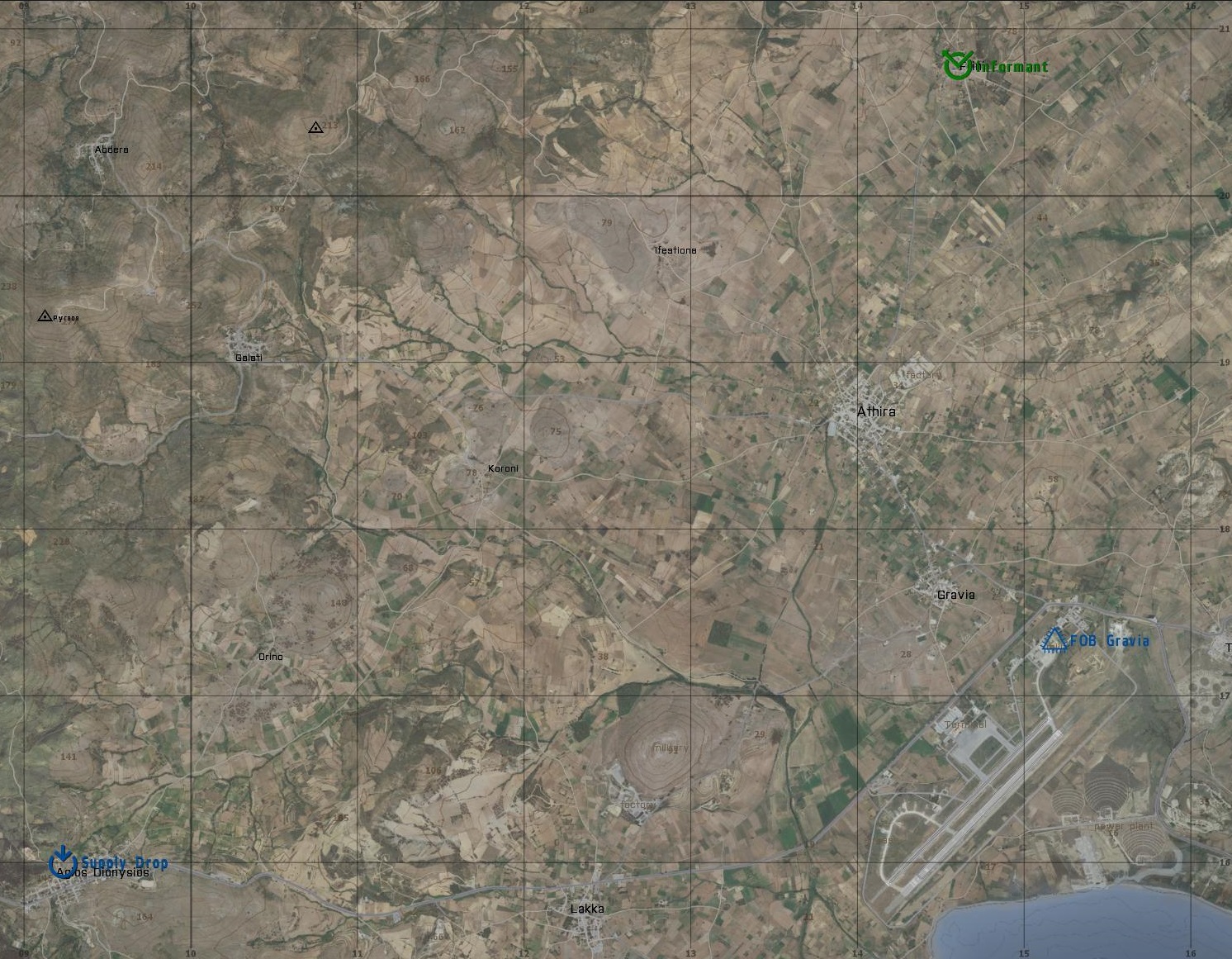 The 1st MEU is occupying all of central Atlis, with regular patrols of the country side. They are in control of Gravia AFB and the surrounding area and strongholds in all the major towns in central Altis. However, those towns may not be secure, due to a shortage of manpower.
