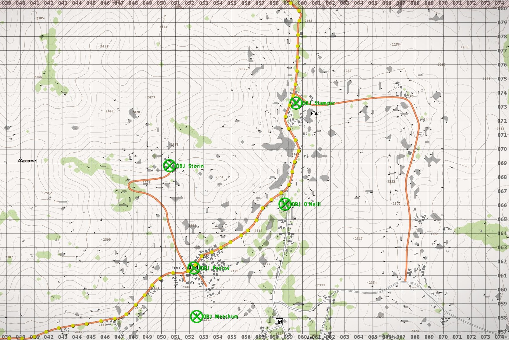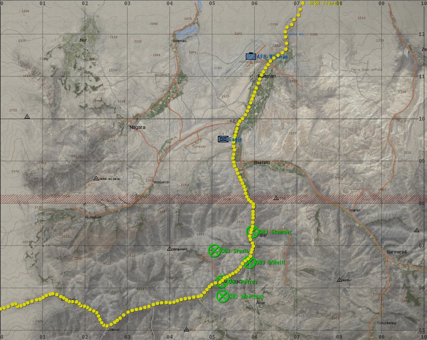Your force is to take Objectives Stamper, O’Neill, Storin, Petrov and Meechum, with the intention of controlling the center of Takistan and the flow of supplies through MSR Francis.