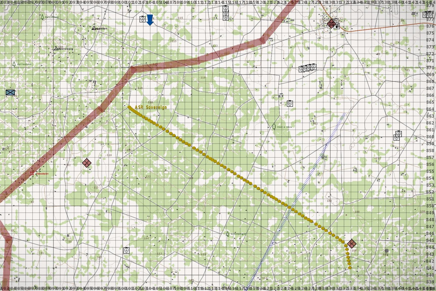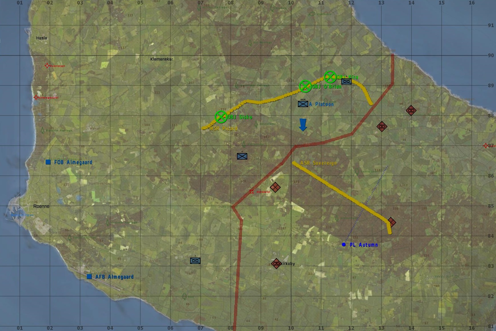 Your force is to launch an attack from OBJ O’Brian and penetrate the enemy line at the start of ASR Sovereign, then clear along it up to Phase line Autumn. Destroy all Supply Depots, fuel stations, comm stations, artillery and other targets of oppertunity. ROE: You are free to engage all armed personnel. Minimize collateral and civilian casualties.